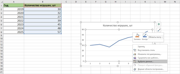 Для начала внесите данные в таблицу. Например, визуализируем, как менялось количество игрушек на воображаемой елке с 2019 по 2025 годы.