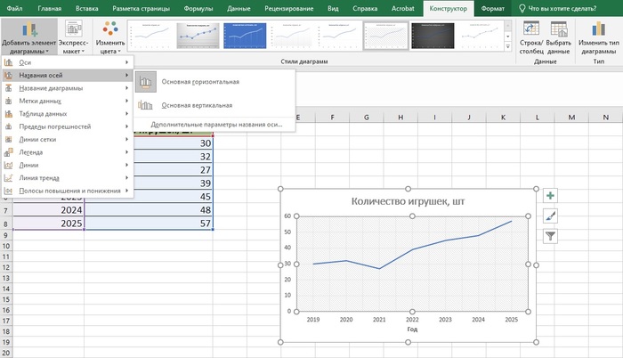 Творческая часть работы — дизайн графика. Поколдовать с тем, как он выглядит, можно в разделе «Конструктор». Здесь выбираем стиль диаграммы, ее цвет, добавляем необходимые элементы. Например, мы присвоили название горизонтальной оси «Год».