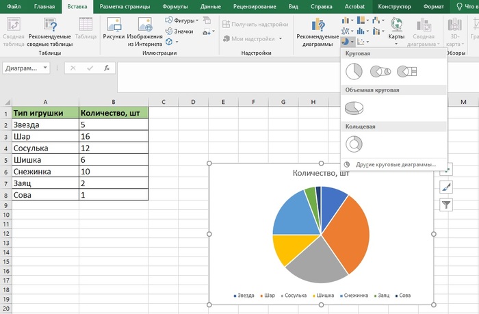 Неважно, какой тип диаграммы вы выберете, алгоритм ее создания будет практически одинаковым. Как и в случае с графиком, нужно выделить столбец с переменным значением, кликнуть «Вставка» и выбрать тип диаграммы.