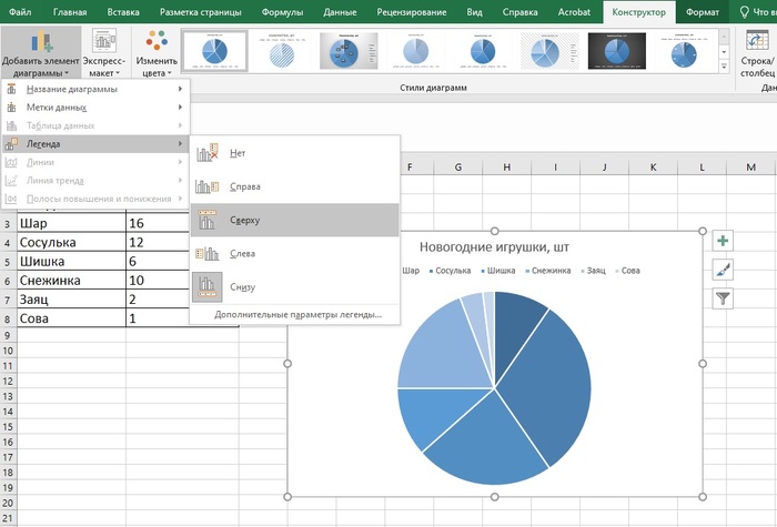 После этого переходим к дизайну. Выбираем цвет — стильно смотрятся диаграммы в одной гамме и контрастных оттенках. Меняем название на «Новогодние игрушки», кликнув прямо по нему левой кнопкой мыши. Также можно изменить расположение легенды — в нашем случае это типы игрушек.