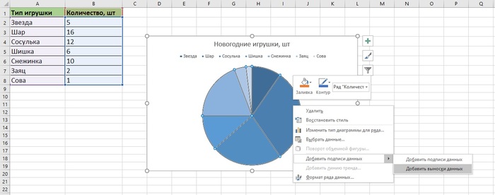 Диаграмма не будет информативной без данных. Чтобы их внести, кликаем по диаграмме правой кнопкой мыши, выбираем «Добавить подписи данных» и один из двух вариантов: подписи или выноски. В нашем случае лучше смотрятся именно выноски.