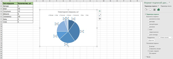 Если нужно отредактировать представление данных, дважды кликаем по выноске левой кнопкой мыши. Справа появится окно, где можно выбрать параметры. Например, для нашей диаграммы выбрали доли в процентах и положение подписей у края, снаружи.