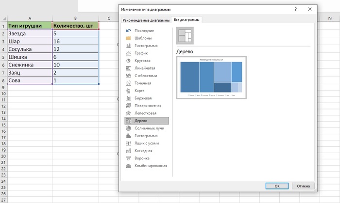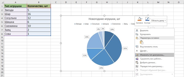 Не обязательно каждый раз строить новую диаграмму — можете изменить тип уже готовой. Например, вам не понравилась круговая диаграмма с данными об игрушках. Чтобы обновить ее, достаточно кликнуть по диаграмме правой кнопкой мыши и выбрать «Изменить тип диаграммы».