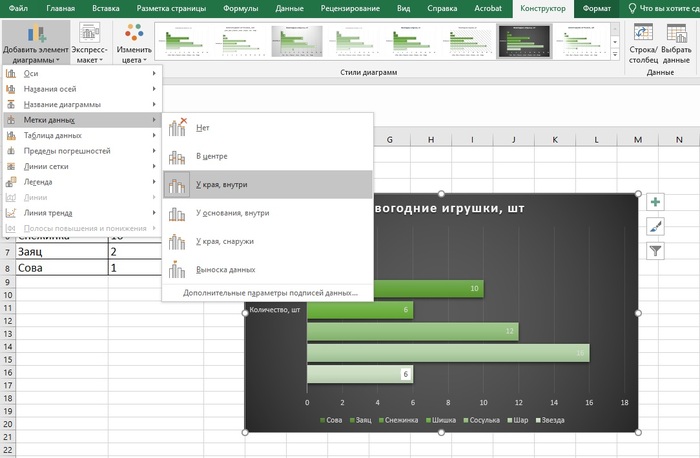 Поэтому после замены типа диаграммы разумно снова обратиться к конструктору и доработать ее. Так, мы заменили цвет и вариант градиента, выбрали стиль с темным фоном. В разделе «Добавить элемент диаграммы» выбрали «Метки данных» и «У края, внутри», а также расположили легенду слева.