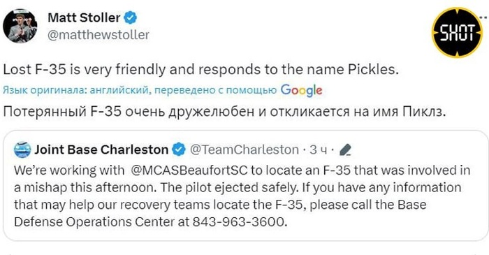 Пилот тестировал F-35B, но что-то пошло не так и ему пришлось катапультироваться из истребителя неподалёку от шоссе, он госпитализирован. Но боевая машина, вместо того чтобы рухнуть на землю, улетела в неизвестном направлении. Пресс-служба Объединённой базы Чарльстон попросила о помощи местных жителей в поисках F-35. Пока следователи разбираются во всех нюансах этого происшествия, люди плодят мемы о пропавшем навороченном самолёте.