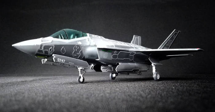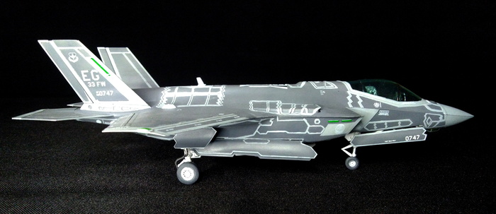 Представлена модель Lockheed-Martin F-35A Lightning II из состава 33-го Истребительного Крыла, авиабаза ВВС США Эглин, Флорида, 2013 год. Вооружён парой всепогодных корректируемых 910-кг (2000 фунтов) авиабомб GBU-31 и парой всепогодных управляемых ракет средней дальности класса «воздух-воздух» AIM-120 AMRAAM. Модель фирмы Italeri, масштаб 1/72.