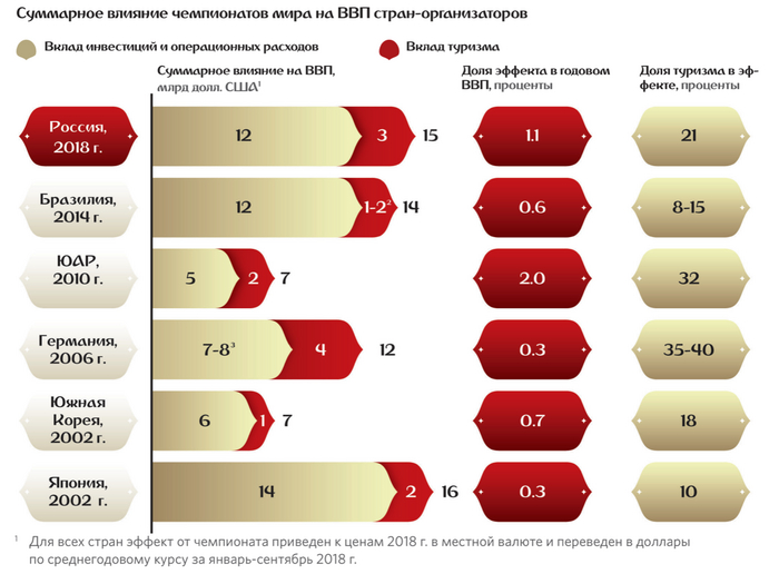 Инвестиции в строительство стадионов создают рабочие места не только для самих строителей, но и для обслуживающего персонала. На чемпионат приедут зрители, которые будут тратить деньги. И невидимая рука подтянет туда бизнес, который соберет огромные прибыли. За время ЧМ 2018 экономика России получила около 3 млрд долларов только за счет туризма, а в целом благодаря чемпионату экономика обогатилась на 15 млрд долларов, что составляет около процента ее ВВП