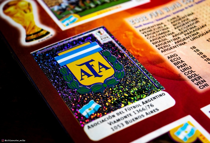 Первая информационная страница. Помню, что наклейки-блестяшки ценились дороже и обменивались по более выгодному курсу (точно не помню, но что-то вроде одна блестяшка на 2-3 наклейки игроков). Выглядели эти блестяшки красиво, и в основном на них печатали эмблемы сборных команд. Эмблема сборной Аргентины: