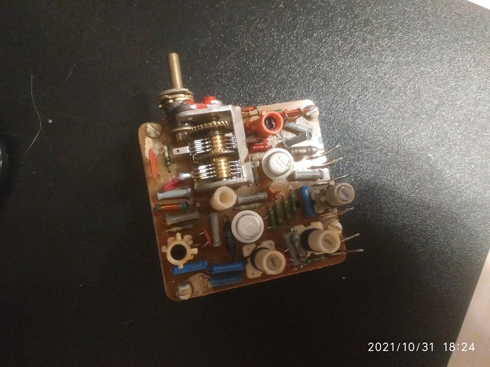 Начинаем с модуля УКВ, перестраиваем контура, включаем, приёмник молчит. Вообще на УКВ звуков не издаёт. Берём эталонный, вставляем в него плату, тоже тишина. Виновником оказался один из транзисторов, у которого со временем h21э скатился с 200 до 25... Заменили. На эталонном звук пошёл. Возвращаемся к пациенту. На нём всё так же тишина. Делаем профилактику усилителю, проверяем переменники. Все диапазоны работают, УКВ нет... Видите, катушки УКВ не залиты воском?) либо их не настраивали, либо сердечники выкрутились от времени. Странно...