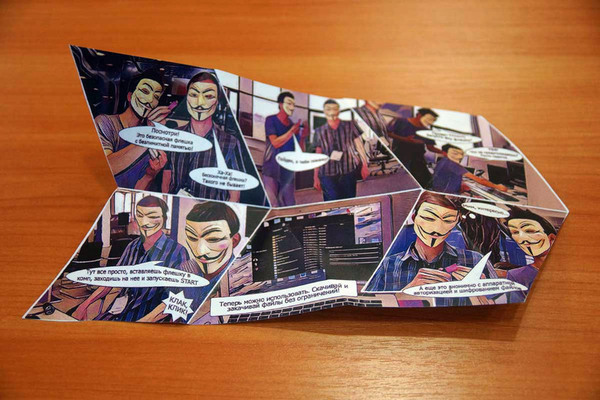 Один из экземпляров «бесконечной» флешки Flashsafe попал в руки журналистов ресурса ProGorodSamara.ru, которые изучили устройство. В треугольной коробке находится само устройство и комикс о создателях флешки.