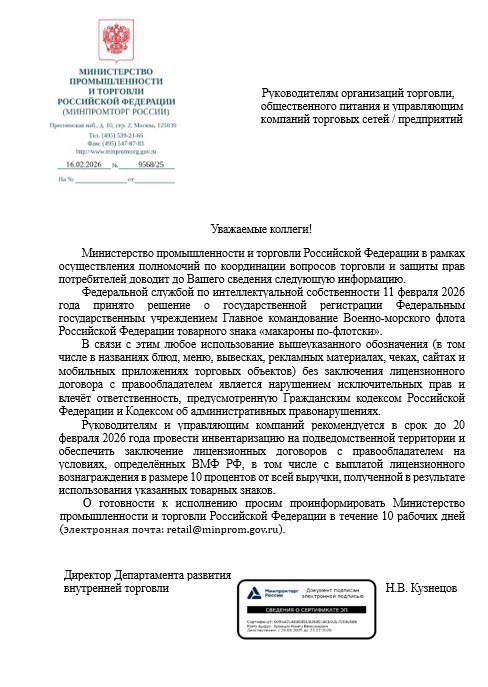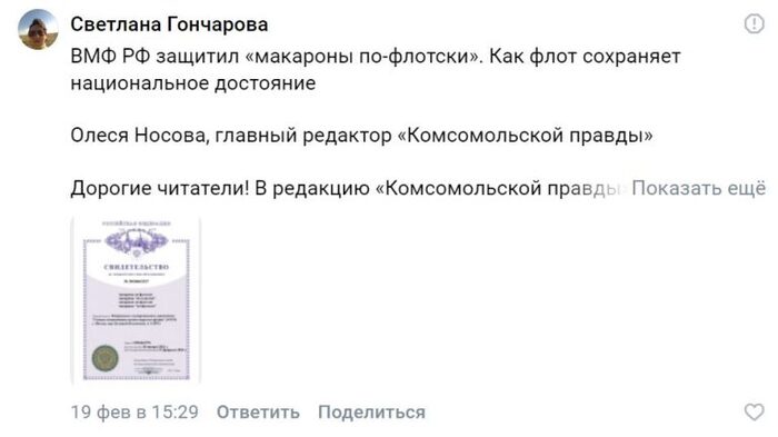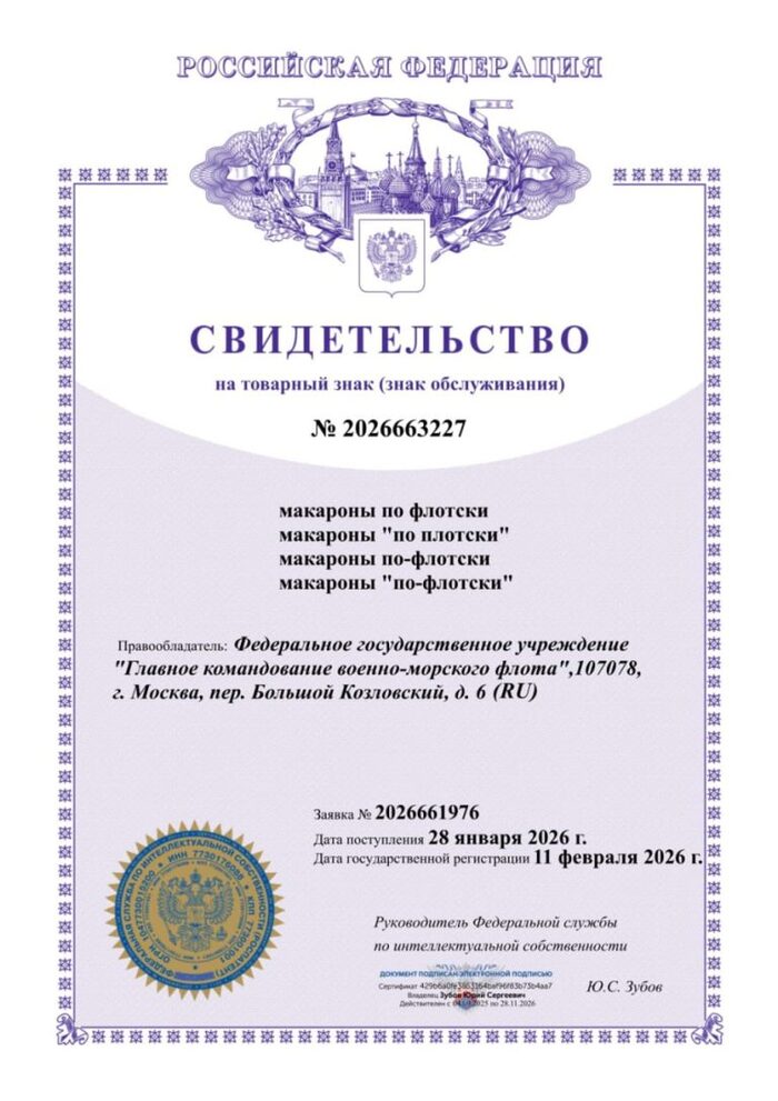 В Сети пишут, что Главное командование Военно-морского флота России якобы зарегистрировало товарный знак «Макароны по-флотски». Теперь торговым сетям и предприятиям общественного питания рекомендовано заключить лицензионные договоры с ВМФ и платить 10% от выручки за использование этого названия.