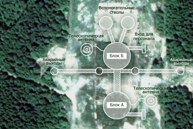 Огромный ангар прикрывает уходящие глубоко под землю шахты. Со спутника разглядеть их просто невозможно. Внутри трубы-спуски разделялись на два пути: один вел к штабному блоку А, второй к инженерному блоку Б. Оба уходили вниз на 62 метра.