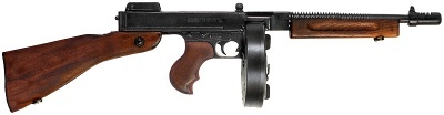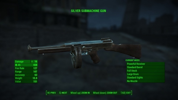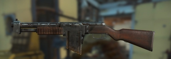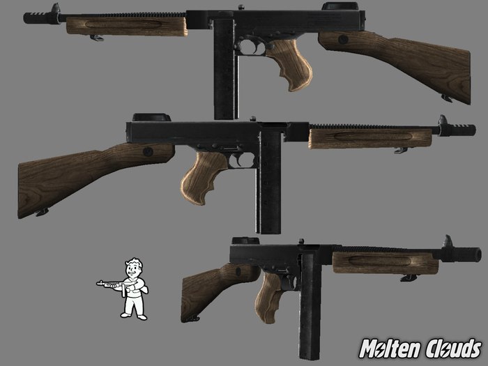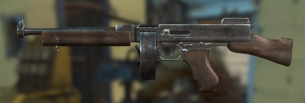 Описание: Классический пистолет-пулемёт Томпсона с барабанным магазином, разработанный компанией Auto-Ordnance в далёком 1920 году. Зарекомендовал себя как любимое оружие гангстеров времён сухого закона и Великой депрессии, а впоследствии активно применялся во время Второй мировой войны. Несмотря на более чем почтенный возраст, сохранилось немало его работоспособных экземпляров, которые и по сей день применяются на территории Содружества. Из достоинств следует отметить относительно низкую (для автоматического оружия) отдачу, ёмкий магазин, высокую скорострельность и доступность боеприпасов. Из недостатков — низкий урон и неоправданно большой вес, а также небольшой ассортимент модификаций.