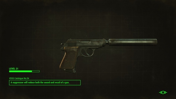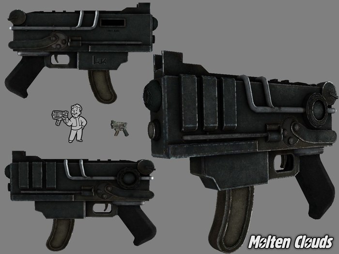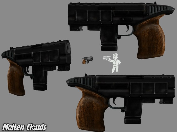 Описание:Самозарядный полуавтоматический пистолет, рассчитанный под 10-мм патроны. Изначально укомплектован глушителем, но его можно снять при нужде. По сравнению со стандартным 10-мм пистолетом обладает чуть худшей точностью и дальностью стрельбы, но заметно более высокой мощностью. Также стоит отметить ёмкий магазин оружия и низкую стоимость выстрела в VATS. Из недостатков можно выделить невозможность установки оптики и переделки в карабин.