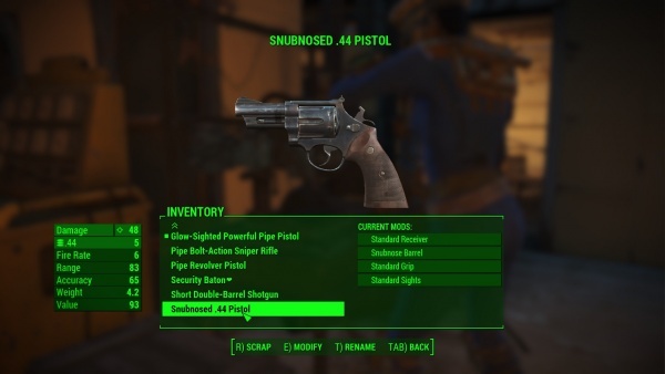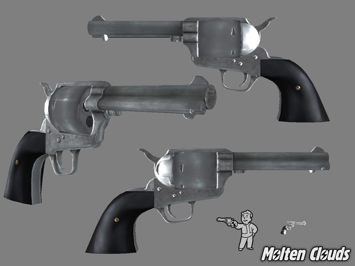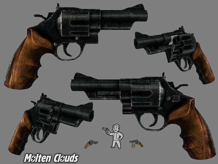 Описание:Довоенный револьвер под мощный патрон .44 Magnum. Классический шестизарядный револьвер с высоким уроном, но большим расходом очков действия при стрельбе в режиме VATS, малой доступностью боеприпасов и отсутствием модификаций надульных насадок.