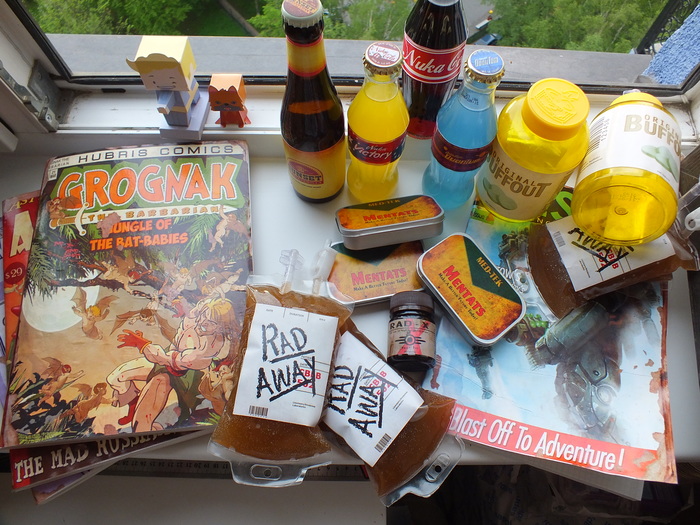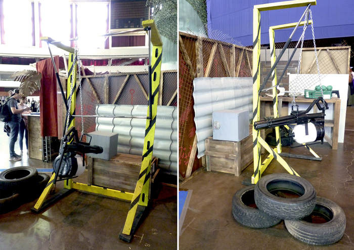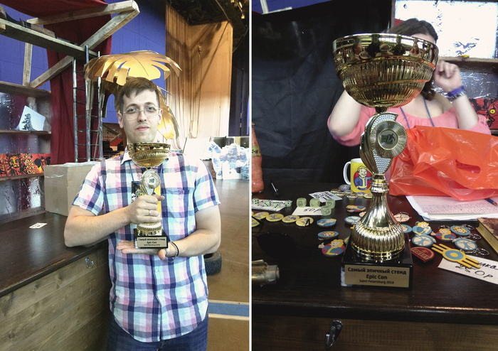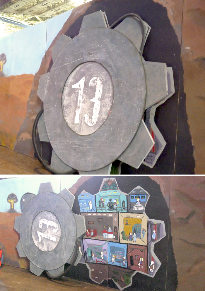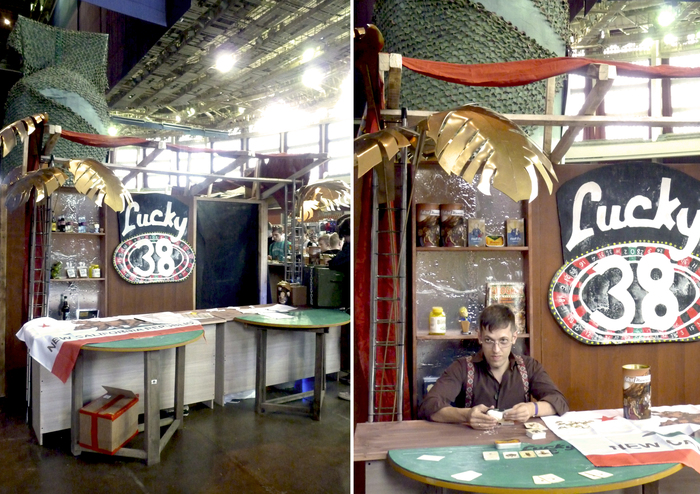 Помимо Казино с настолками и Бара-магазина у нас была фото-зона с классической композицией "Убежище и ядерный гриб". А так же подвесной миниган и плазменная винотовка из оригинальной дилогии Фолыча - вот они пользовались бешенным спросом у посетителей. Серый ящик на заднем плане - самопальный деревянный сейф с электронным кодовым замком, но мне кажется те кто его открывали по стендовому квесту, делали это силой, а не кодом)