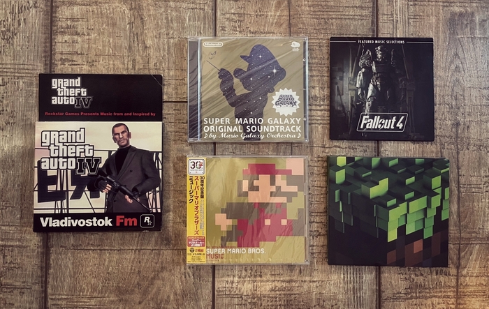 Диски Soundtrack-и, все на сиди: Grand Theft Auto IV Vladivostok FM Super Mario Galaxy Original Soundtrack The 30th Anniversary Super Mario Bros. Brothers Music Fallout 4: Featured Music Selections MINECRAFT Volume Alpha Video Game Soundtrack