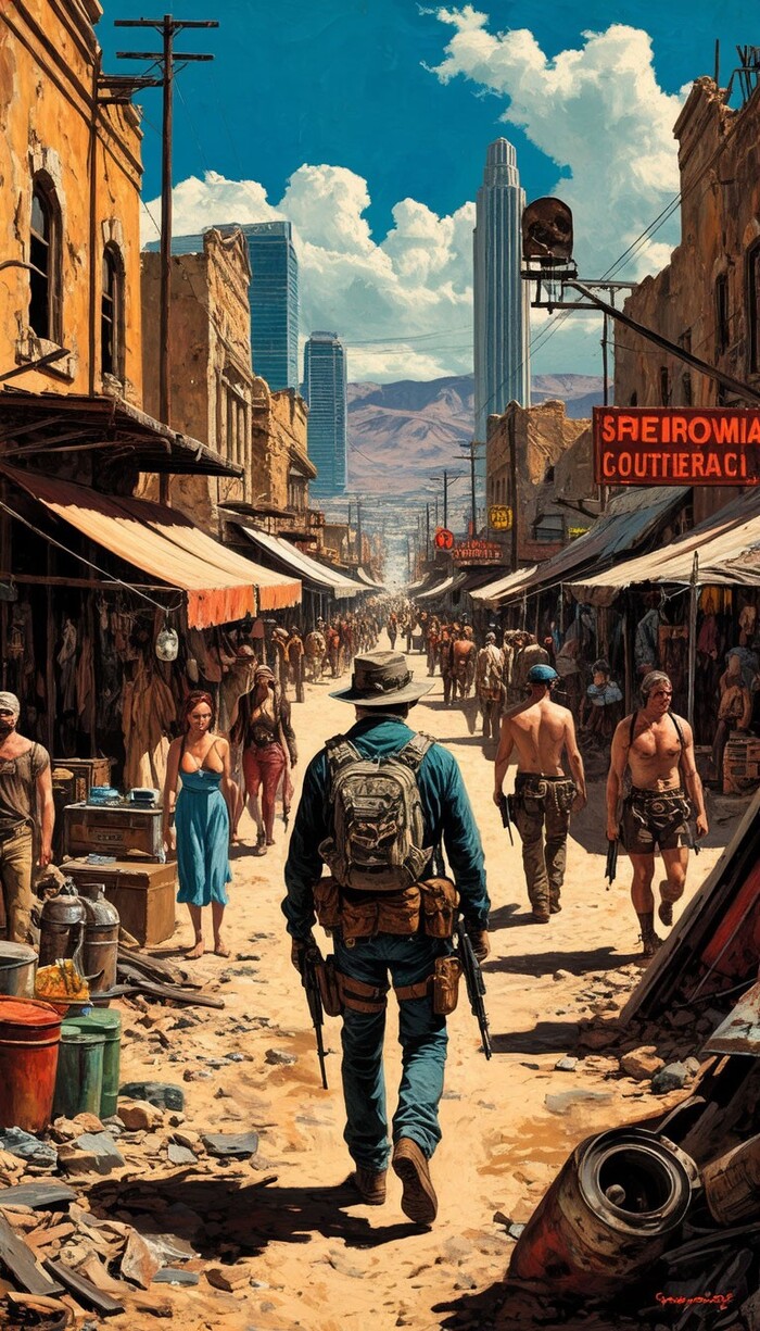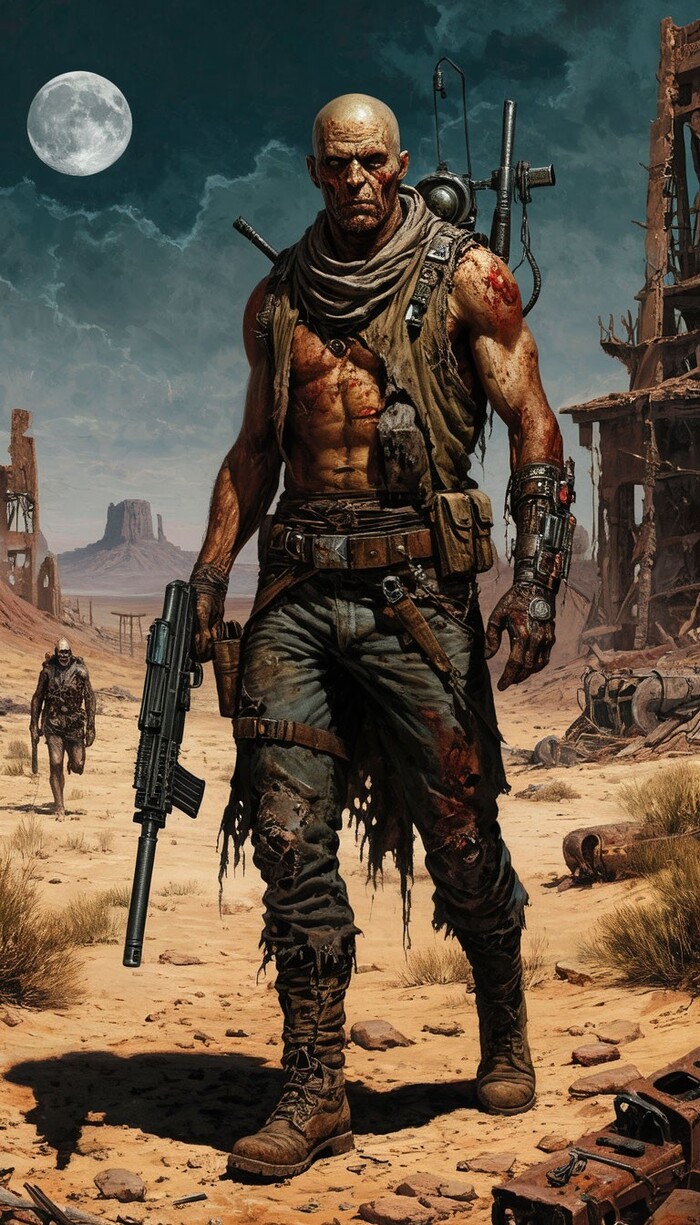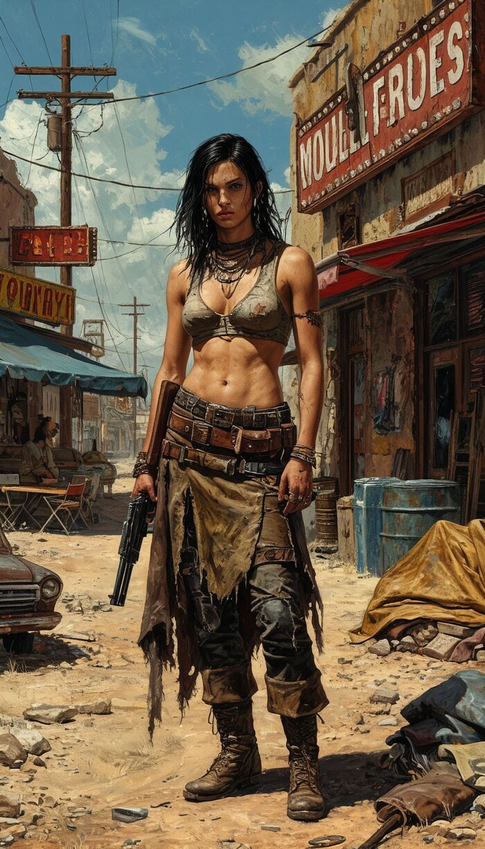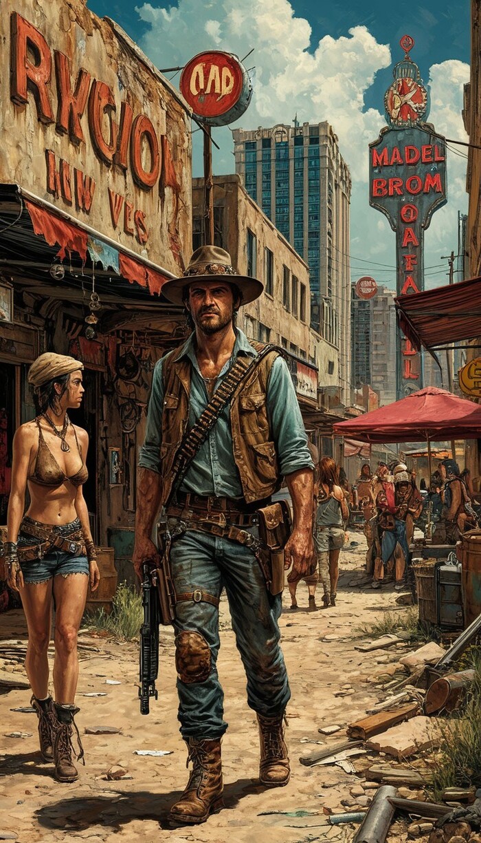 Они не целовались. Это было бы слишком просто. Она запустила руку под его рваную броню, пальцы скользнули по шрамам, по мускулам, твёрдым, как бетон. Он схватил её за талию, металл её рёбер холодил кожу, но это было правильно — как будто так и должно быть. Их тела соприкоснулись — сталь и плоть, ржавчина и кровь, ритм пустоши.