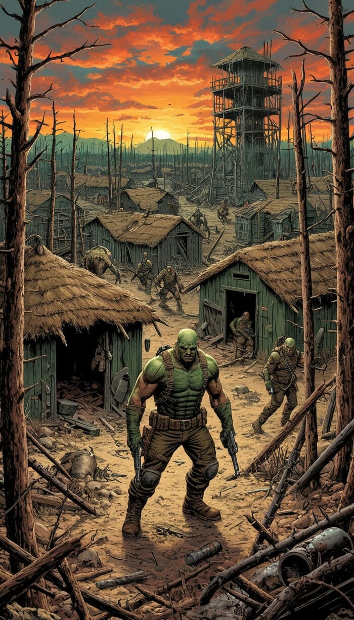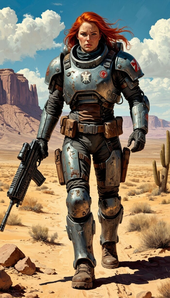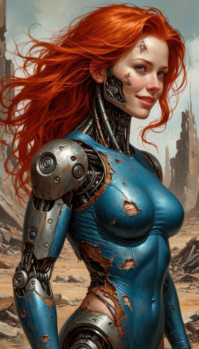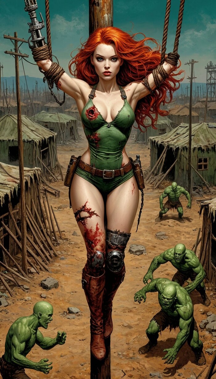 Лагерь рейдеров вонял, как открытая могила: палёная резина, пот, гниль надежды. В клетках, где цепи скрипели, как последнее дыхание, Супермутант и Соня нашли друг друга. Он — Кувалда, глыба мускулов, кожа цвета болотной жижи, глаза — тлеющие угли. Она — Соня, рыжая, с прядями, липнущими к потному лбу, в комбинезоне Убежища 88, который всё ещё обтягивал её, как кожа, которой у неё почти не осталось. Её плоть облезала, обнажая стальной скелет синта, но даже с рваными лоскутами кожи она была красива — не как довоенная кукла, а как пустошь: дикая, ржавая, смертельная.