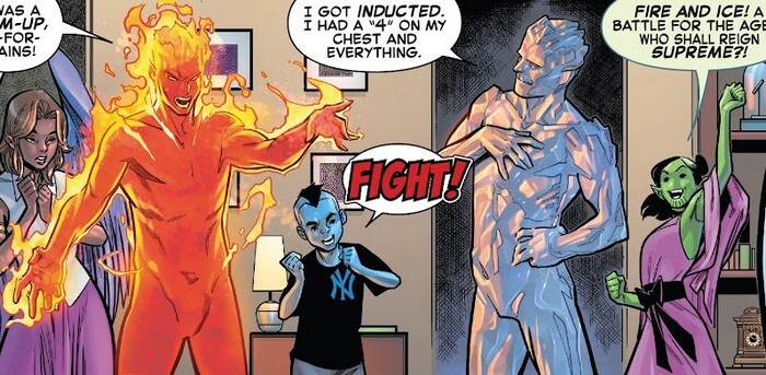 Сегодня фантастика начнётся с комикса Fantastic Four #24 за ноябрь 2020 года, с историей от Дэна Слотта и рисунком от Пако Медины. Гаплык, раскрутившийся на фоне прошлой подборки, миновал. Джо-Венн (малыш Кри) и скруллочка Н’Калла не будут беспризорниками – бюрократия улажена, теперь они официально дети Бена Гримма (Существа) и Алисии Гримм (бывшей Алисии Мастерс). Начинается обычная бытовая нервотрёпка. Невидимая Женщина (Сью Ричардс) истерит на тему внешности Франклина Ричардса, сына. Она уже почти смирилась с тем, что он перекрасился в брюнета, но теперь он ещё и серьгу в ухо затурнул! «Я рожала тебя несколкьо часов! Нам потребовалось отжать жезл у Аннигилуса! Не тебе решать, как ты должен выглядеть!». Эх... одна из заметнейших супергероинь Марвел и женщин в комиксах вообще, а всё равно яжмать :( Попутно Человек-Факел (Джонни Шторм) и Ледяной Человек (Бобби Дрейк) гавкаются на тему того, можно ли считать Бобби членом Фантастической Четвёрки, и Бобби, собственно, и припоминает тот случай, когда он стал членом команды. Было это очень много лет назад. Тогда Человек-Факел в сердцах покинул Четвёрку, придя к выводу, что он популярнее как соло-герой, а Ледяной Человек сбежал от Людей-Икс, когда те подняли его на смех в Комнате Опасности.