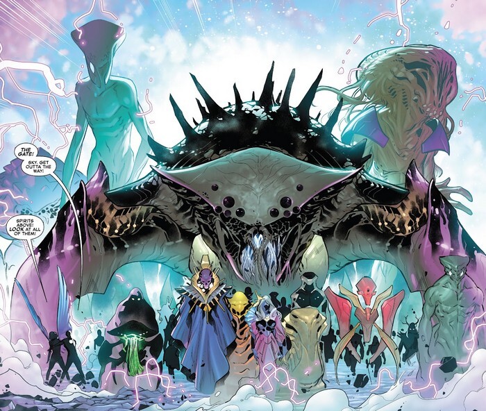 А у Франклина Ричардса своя беда – Профессор Икс больше не пускает его тусить на Кракоа, остров мутантов. «Франклин, ты не мутант и никогда им не был. В детстве ты хотел быть особенным и несознательно использовал свою силу, чтобы создать видимость наличия Икс-Гена, но это не делает тебя мутантом. На Кракоа тебе больше не рады». Печаль...между тем, Четвёрка с помощью портала призывает на Землю Фонд Будущего...и радость от встречи с детьми-гениями вскоре сменяется тревогой, потому что к открывшемуся в космосе входу в портал вслед за кораблём Фонда летят другие звездолёты. Ну и вот, назревает очень напряжённый разговор между Джонни и Скай – с Фондом Будущего прилетела скруллиха Лайджа, если кто её помнит, и Джонни приходится объяснять Скай, что она не его первая девушка, и вообще девушек у него было дофигища. Скай обижается...и тут через портал начинают переть инопланетяне всех форм и размеров! Они говорят на сотнях языков, перегружая универсальные переводчики! Вторжение? Нет...инопланетяне не агрессивны. Они испуганы. И Франклин вскоре их узнаёт. Это выжившие жители сотен созданных им вселенных, которые пришли просить у своего бога защиты от той, которая эти вселенные уничтожила – Скорбящей (Griever)!