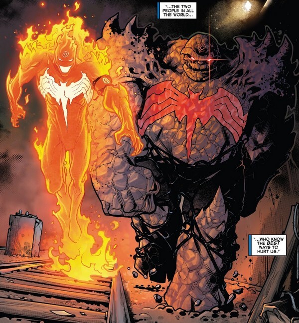 Обращённые Бен и Джонни нападают-таки на дом Фантастической Четвёрки, и конечно же, тоже не затыкаются, капая на мозги Риду и Сью. Джонни распекает Сью за то, что та пытается быть его мамкой, Бен «критикует» Рида, утверждая, что для Рида на первом месте наука, и ради неё Мистер Фантастик готов пожертвовать кем и чем угодно. Впрочем, от симбиотов удаётся огородиться за электрическим барьером, а замут с Кнуллом заканчивается эпическим сражением в другом комиксе (новый уровень раздёргивания сюжета. Читаем до 14 страницы и переходим в другой комикс, потом в третий, а дочитав их, возвращаемся на 15 страницу). Этот же комикс заканчивается тем, что мир восстанавливается от вторжения симбиотов. Все герои уже пришли в норму физически, но многие угнетены морально. Потому что всё, что говорили герои под контролем симбиотов – это не ложь. Это их мрачные мысли, которые им раньше совесть не давала высказать. Недобрые мысли порой возникают даже в отношении самых близких и любимых людей. Всё, что сказали Бен, Джонни и Валерия (и многие другие) – они хотели сказать это и без симбиотов, да стеснялись. И сейчас им очень неловко. Зато Джонни потихоньку свыкается с тем, что Скай – действительно его соулмейт. Но Сью продолжает за их свиданиями следить из невидимости...