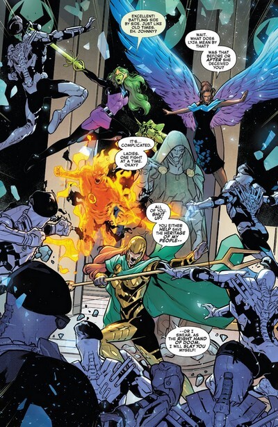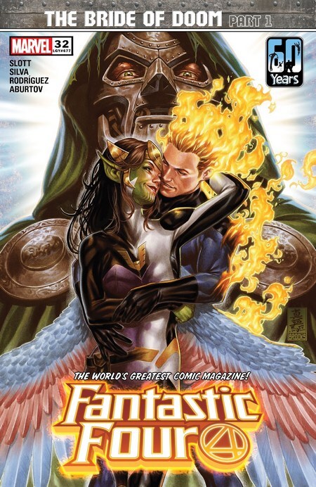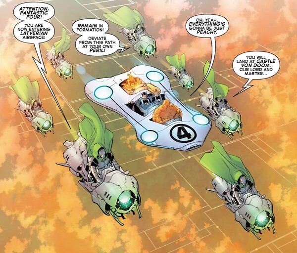 Это ведёт к комиксу, который сегодняшнюю часть фантастической подборки завершит – Fantastic Four #33 за август 2021 года, от Дэна Слотта и Р.Б. Сильвы. Зора готовится к церемонии и волнуется (тем более, она родом не из Латверии, родилась в Симкарии), но Дум её успокаивает. «А я и вовсе потомок цыганских крестьян, и ничего, теперь правлю страной. И вообще, я Симкарию недавно аннексировал и присоединил к Латверии, Симкария наша». Виктор фон Дум полностью доверяет Зоре и уверен, что между ними нет никаких тайн...ну а Фантастическая Четвёрка обсуждает, стоит ли являться на свадьбу в качестве гостей. Рид уверен, что стоит – тем более, по латверийской традиции, всем приглашённым на свадьбу прощаются все прегрешения. Авось это охладит пыл Доктора Дума! Детей с собой Четвёрка на всякий случай не берёт. А ведь Валерия соскучилась по дяде Думу! Четвёрка отправляется в Латверию, Дум всех относительно радушно приветствует, выделяет для героев комнаты в своём замке. В Латверии им придётся переночевать, после чего на следующий день уже будет церемония. Перед этим Зора успевает связаться с Джонни через робота и сообщает, что интересы Латверии для неё важнее её собственных интересов, так что неважно, хочет ли она сама замуж.