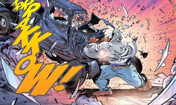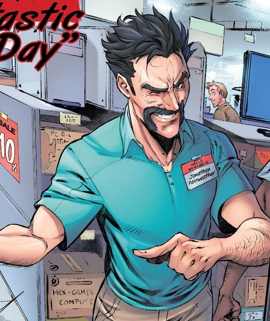 Но это не отвечает на вопрос, что произошло в Нью-Йорке, так что давайте заглянем в комикс Fantastic Four #3. Первый выпуск был посвящён Бену и Алисии, второй – Риду и Сью, так что третий, ожидаемо, за Джонни Штормом. И сейчас на городок, где временно живёт Джонни, движется мощнейший торнадо! Факел останавливает торнадо, подогрев его и сетует, что приходится теперь жить в относительном Мухосранск-сити, потому что в Нью-Йорке запретили супергероев после того, что наделала Фантастическая Четвёрка. И Бакстер-Билдинг больше нет – вместо него и района вокруг дымящийся кратер. Счета Четвёрки заморожены. Деньги нужны, но Джонни Шторма никто не соглашается взять на работу...значит, нужно замаскироваться! Краска для волос (сгорает при каждом воспламенении, и это даже полезно), усы (настоящие), и вуаля, Джонатан Фэйруэзер! (буквально “ясная погода”). Да только Меррилл, владелец фирмы, куда “Фэйруэзера” принимают без документов и проверки личности – тот ещё хмырь и вообще не заботится о здоровье подчинённых. Джонни отправляется поговорить с ним не как подчинённый, а как Факел. И-и-и разговор не идёт по плану. “И что ты мне сделаешь? Я знаю, супергерои не убивают и без необходимости даже пытки не устраивают. Я буду творить со своими работниками всё, что захочу, и ты меня не остановишь. Огонь – штука грубая, с ним особо не сдержишься. Ты либо бьёшь в полную силу и не боишься причинить серьёзные ранения, либо не бьёшь вообще”.