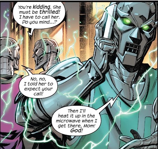 Что же случилось? Не ответит комикс Fantastic Four #2. Сью Ричардс обедает в кафешке с мужем, умнейшим человеком на Земле. Рид Ричардс всё ещё винит себя в том, что случилось в Нью-Йорке. ВНЕЗАПНО все остальные посетители и официантка превращаются в Думботов! А затем, получив пару раз по кумполу, вновь принимают человеческий облик, и такие “Сперва Мистер Фантастика и Невидимая Женщина целый квартал Нью-Йорка уничтожили, а теперь людей в кафе бьют, жуть что творится!”. Прибывший полицейский вывозит Рида и Сью за город. “Я знаю, вы герои. Поэтому я вас не засажу. Просто не возвращайтесь”. Разумеется, они тут же возвращаются, под покровом невидимости. И видят странную картину – люди время от времени превращаются в Думботов, но при этом продолжают вести себя, как обычные люди, болтать между собой и по телефону. “И она такая, так чо мне теперь, ждать тебя?/До семидесятого левела докачал и забил, гринд один/Нет-нет, будет готово к среде, как и договаривались”. Похоже, человеческий облик они принимают в определённом радиусе от одной конкретной бабульки, а триггерятся в агрессию от слов “Рид Ричардс” и “Сьюзен”. Рид решает поговорить с бабкой, сменив внешность. “Мэм, а вам Виктор фон Дум часом не знаком? – Ну как же. Много лет назад встретился мне. Голодный студентик. Взялась его подкармливать, он обещал отплатить. А потом пропал. Дела давно минувших лет, а что? – Да так, мы знакомы. Я Рид Ричардс. – Неплохое имя”. Бабка не триггерится. Это человек! Дум окружил её роботами в качестве благодарности – они защищают старушку от любой беды.