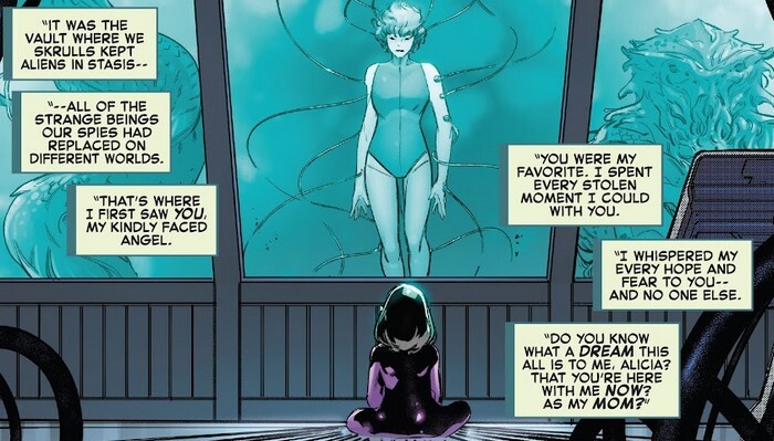 Новые приключения поджидают команду в комиксе Fantastic Four #31. Пока остальные спят, Рид Ричардс и Бен Гримм решают воспользоваться Вратами Вечности, чтобы шагнуть в неизвестное (в чём-то Бен был прав – неизвестное всегда манит Рида, просто в нормальном состоянии Бена это даже забавляет). На Земле скруллочка Никки, предаётся воспоминаниям. Когда Н’Калла была совсем маленькой, её беспощадно тренировали в искусстве ведения боя. Но короткие минуты отдыха «Никки» проводила в хранилище, где находились в стазисе все существа, которых скруллы заменили собой на разных планетах. Там Никки впервые увидела Алисию и сразу стала считать Алисию своим ангелом-хранителем, восхищаясь ей. И теперь она нарадоваться не может, что Алисия стала её мамой! А пока Никки радуется, Рид и Бен исследуют странное измерение...которое, на беду, оказывается «Мыслепространством». Почему «на беду»? Оно реагирует на мысли попавших в него существ. Рид видит в нём решения научных проблем, а Бену скучно, и он такой «Ваще заняться нечем, хоть бы гаду какому-нибудь морду набить!». И-и-и квантовые облачка, заполняющие измерение, превращаются в толпу злодеев и монстров!