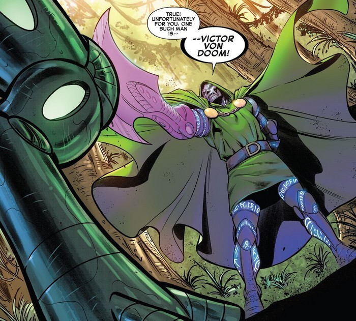 И сегодняшний пост начнётся с комикса Fantastic Four #43 за июль 2022 года, с историей от Дэна Слотта и рисунком от Ричарда Стотта и Андреи де Вито. Вторжение Расплаты на Землю продолжается. Воин Расплаты собирает “Броню Альфа-Омега”. Уже собрал нагрудник, пояс, меч, ножны и правую перчатку (которую сорвал с руки одного супергероя вместе с кожей). Поножи воин отбирает у Мстителей Великих Озёр, отметелив всю команду (даже Девушку-Белку!), левую перчатку – у мелкой суперзлодейки (вместе с рукой). Осталось добыть последнюю часть брони – Тактигон, единственное оружие, эффективное против этой брони. На Земле очень мало людей, способных пользоваться Тактигоном. Правда, он находится во владении одного из способных, Виктора фон Дума! Руина (одна из Расплаты) в это время рассказывает злодейский план заложникам (Алисии Гримм, Франклину и Валерии Ричардс, а также Джо и Никки, инопланетным детишкам). Расплате позарез нужно завладеть тремя “Ядрами Реальностей”. И два (Кристалл Мкраан и болото Лешего) они уже захватили. Осталось третье – созданный Фантастической Четвёркой портал. Руина отправляется к своему пункту назначения, приказав бойцам убить заложников...Франклин и Валерия сигают в портал за ней и портал закрывается – в нём оставалось энергии на одну “ходку”. Алисия паникует – как теперь вернуть застрявших невесть где Бена Гримма (Существо, её мужа), Рида и Сью Ричардс (Мистера Фантастику и Невидимую Женщину)?