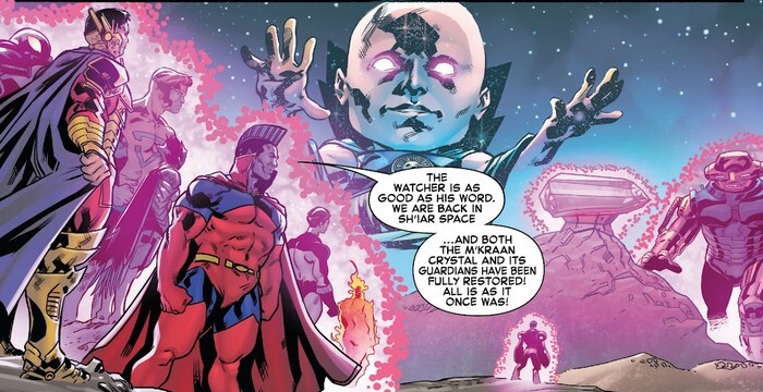 Доктор Дум вламывается в хранилище опаснейших артефактов и добывает самый опасный, а с Ридом связывается Сёрфер. По всей вселенной миллионы кризисов, но почти все из них – пустышки, призванные отвлечь внимание от нескольких ключевых. Ну то есть, в них всё равно гибнут триллионы разумных существ, но это пока что ещё допустимые потери. Рид Ричардс видит кризис ключевой: нужно отправиться на планету Шиар и защитить кристалл Мкраан. Вопли Джонни о том, что нужно спасать Спайр (родную планету Скай) не учитываются. Психанув, Джонни улетает в самоволку. А Рид такой “Я учёл это в расчётах. Джек Харт, Червовый Валет, добро пожаловать в Фантастическую Четвёрку”. Выдав Нику Фьюри особую миссию и пропустив его через портал, позволяющий попасть куда угодно, Рид собирает Четвёрку (с Валетом, но без Джонни) и команда отправляется к Кристаллу. А Уату собирает-таки всех Наблюдателей. “Хватит отсиживаться, Наблюдателям пора отправиться на войну!”. Фантастическая Четвёрка же прибывает на планету, где находится кристалл Мкраан. Если он будет уничтожен, всё сущее схлопнется. Обычно его охраняет Имперская Стража Шиар, включая Гладиатора (одного из Марвелских Супермэнов, который по силе превосходит Гипериона и Халка, вместе взятых). Увы, Стража в целом и Гладиатор в частности уже побеждены. Бен Гримм узнаёт инопланетянку, которая победила Стражу. “Когда Скорбящая заставила нас увидеть дни нашей смерти (в 28 выпуске, в прошлой подборке)...я увидел её. Она меня убьёт. Рид, ты же теперь знаешь ВСЁ, скажи, как нам выкрутиться? – Пока никак. Мне, кстати, и самому осталось жить три дня. – Чего?! – Знания, не предназначенные для человеческого мозга, убивают меня”.