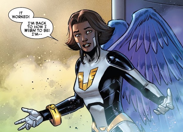 Но где Франклин и Валерия? Застряли в Мыслепространстве, победив Руину. Не то чтобы застряли...Валерия уже создала портал, но пройти через него первой не может, иначе созданный на её воображении портал после её прохода закроется. А Франклин уходить не хочет. Он был богом, потерял космические силы, а теперь вернул их и не хочет вновь их терять, хочет вновь бесконечно создавать. Впрочем, родители уговаривают его вернуться на Землю, где способностей у него не будет...но сначала он меняет себя перманентно. Не сильно – просто делает свои волосы чёрными от природы, чтобы больше не красить их. Остаются мелочи – Рид считает, Врата Вечности (портал, позволяющий попасть куда и когда угодно, созданный в прошлых подборках) надо разобрать. Слишком он опасен. А затем можно и отпраздновать. Без Гнева прибывшие войска Бадун сливаются. Мстители уничтожили их флот, а Лунный Рыцарь и Девушка-Белка сбили “звезду смерти”. В качестве последнего вмешательства Уату восстанавливает уничтоженную в прошлых подборках Луну. Прямо вместе с принадлежавшей некогда ему цитаделью. И отдаёт Нуллификатор Нику Фьюри. “Я поручаю Нулификатор и свою цитадель тебе, Николас. Теперь это твоя дозорная башня. Ты вновь Человек на Стене, Незримый Щит, охраняющий человечество!”. Доктор Дум же возвращается в Латверию и собирается использовать знания и технологии Наблюдателей, чтобы построить собственные Врата Вечности!