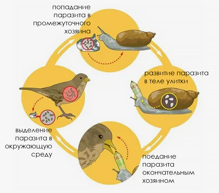 Мало приятного, когда через тебя растут, ещё неприятнее, когда тебя лишают глаза, а то и обоих, но хуже всего то, что паразит берёт улитку под свой контроль, лишая её силы воли. Теперь она больше не прячется, она выползает на самое видное место и ждёт подходящую птицу. Ещё и рожками-паразитами шевелит, чтобы пернатые точно её не проглядели.
