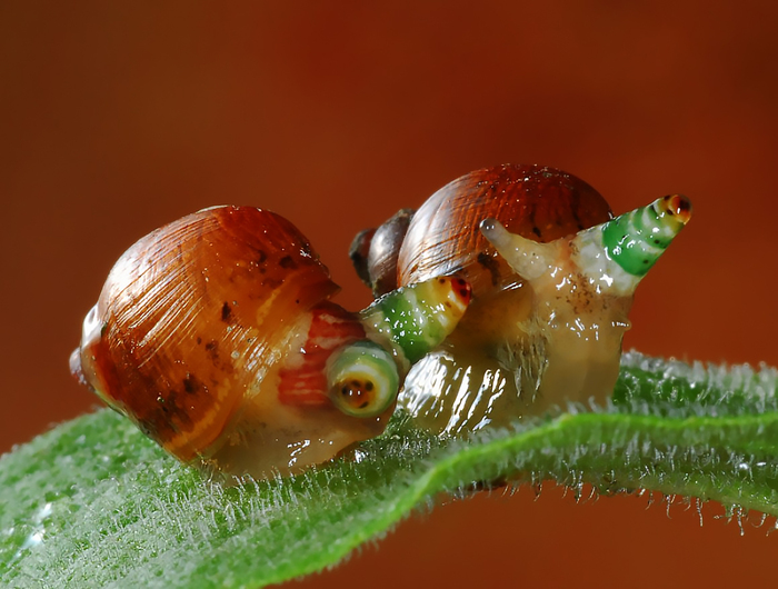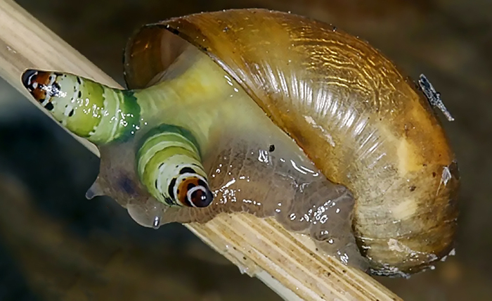 Вытягиваясь в трубки, они растут и растут, пробираясь внутри тела улитки в направлении её глаз.