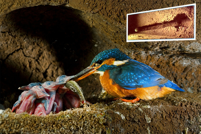 Вы наверняка замечали эти отверстия на склонах рек, вот только знать не знали, что это вполне может оказаться работой чудесных рыбаков-зимородков. Впрочем, даже если у вас когда-нибудь появится возможность заглянуть в такое отверстие, чтобы убедиться воочию, то я вам настоятельно этого не рекомендую. Во-первых, не стоит мешать семейному быту птичек, а во-вторых, запах вам совершенно точно не понравится, ведь зимородки выкармливают своих детишек той же рыбкой, которой питаются сами, и весь пол в норе устлан рыбьими объедками, источающими соответственный аромат.