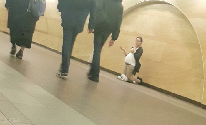 "Кто не из Петербурга объясняю, это известная "беременная" попрошайка, которая уже примерно несколько лет на разных станциях (в основном, на переходе со Спасской на Сенную, бывает и на Академической и пр) клянчит деньги.