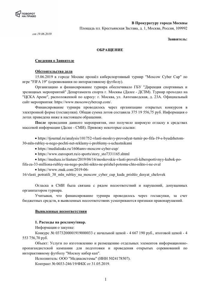 Юристы Telegram-канала «Поворот на Право» обратились с жалобой в прокуратуру Москвы, в которой просят принять меры прокурорского реагирования и провести проверку действий лиц, связанных с организацией турнира.