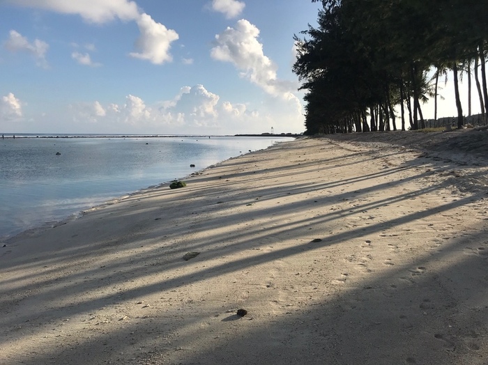 Пляж остров Укулхас просто огромен по сравнению с Тодду. Он начинался от нашей гостиницы и продолжался до самой пристани. Песок такой же белый, но намного мельче, чем на предыдущем острове. А вот вход в море подкачал: всё дно усыпано мертвыми кораллами и купаться без специальной обуви просто не реально! На фото ниже наверное самая узкая часть пляжа.