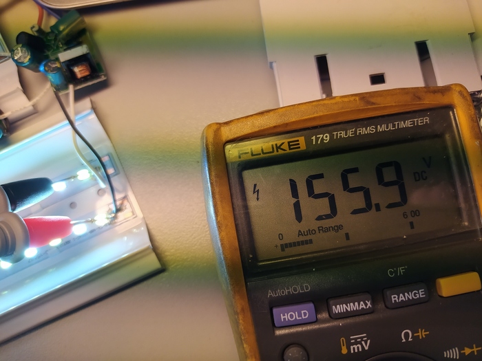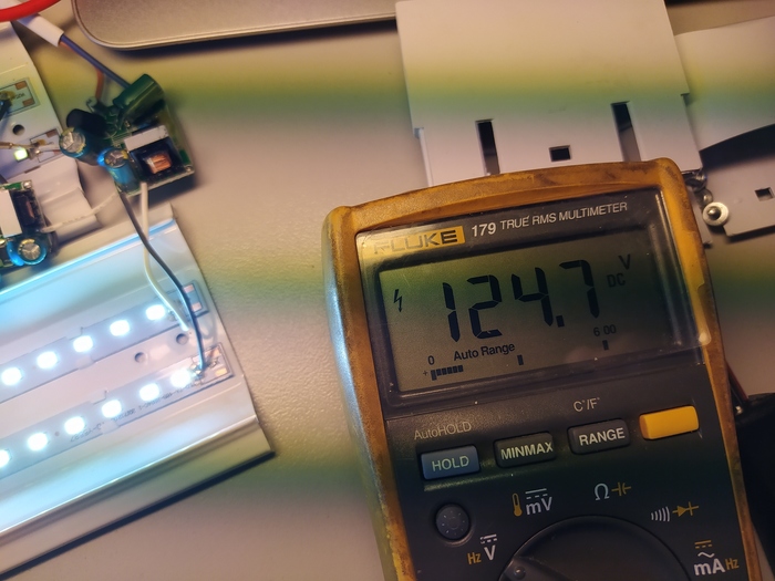 Дефектная плата выдает почти 125 вольт VCC, чего естественно не хватает для нормального свечения светодиодов на ленте.
