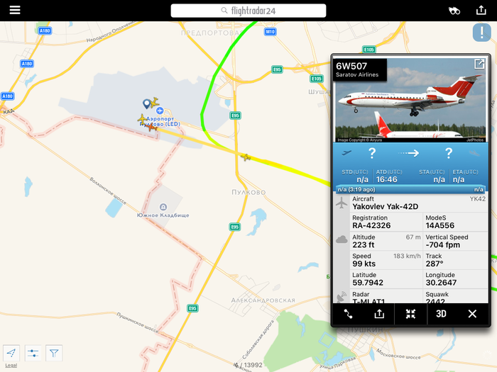 Пулково закрылось, никого не принимают. Маленький Як-40 ждет погоды. В отличие "коллег по очереди на посадку" его далеко не отпускают, он ближе всех.