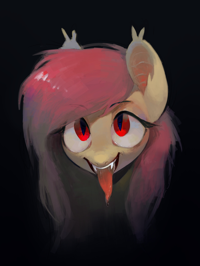 «Эм, ладно, признаюсь, друзья! Мои седые пряди появились не из-за того, что я старая — я не настолько стара! — но с тех пор, как всё пошло наперекосяк из-за вторжения теней в наш мир, я на самом деле бэтпони! Ну, не обычная бэтпони, а бэтпони-вампир! Иногда я перевоплощаюсь и пью кровь!» — признаётся Флаттершай