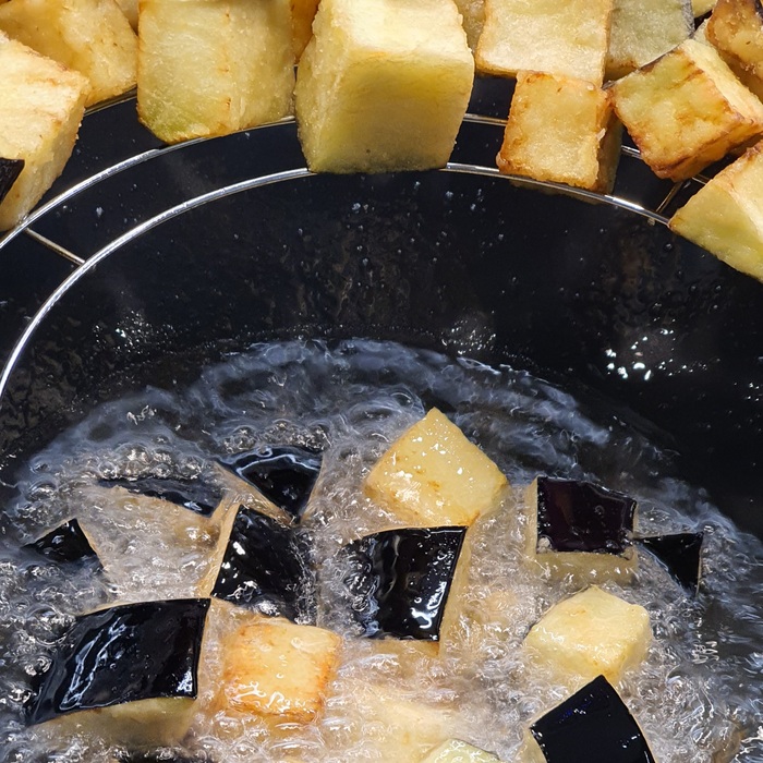 Баклажаны обвалять в кукурузном крахмале (можно с помощью пакета), партиями обжарить в масле на сильном огне, готовые кусочки выложить в миску.