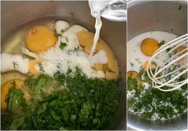 К яйцам добавил сливки (можно, кстати, просто молоко), зелень и хорошо все перемешал. Взбивать не стал. Просто перемешал.