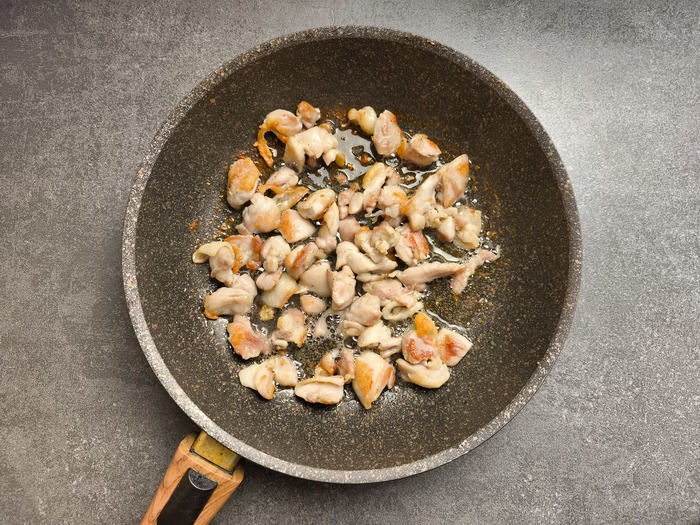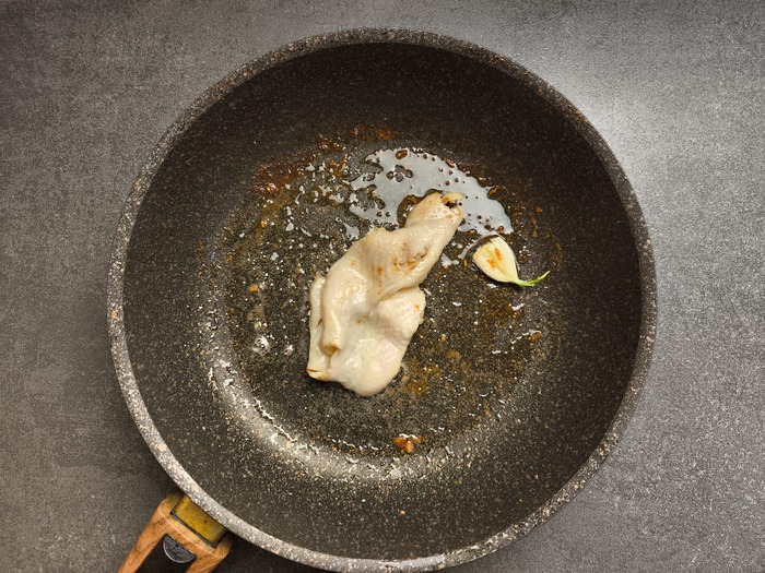 3. Я дополнительно обжариваю с зубчиком чеснока еще шкурку от курицы. Обычно она отправляется в бульон, но тут мне нужен жирок из нее) можно это действие проделать вместе с обжариванием мяса.