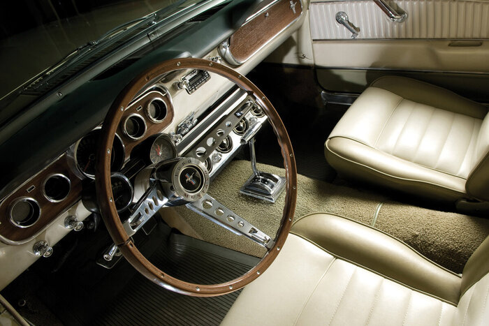 Так что же собой представлял ранний Ford Mustang? Прежде всего, моднейшую штучку с кузовами фастбек, хардтоп-купе и кабриолет. Длина кузова практически как у донорского Falcon (4613 мм), но колесная база чуть короче — 2743 мм против 2781 мм. Моторы опять же от «Фэлкона» — от ни на что не претендующей рядной «шестерки» Thriftpower объемом 2,8 литра до 4,7-литрового V8 (289 кубических дюймов). Самый крутой в гамме — 289 HiPo с увеличенной степенью сжатия и отдачей в 275 л.с. Передняя независимая пружинная подвеска в стандартном виде довольно дряблая. Это отмечали американские эксперты, например, авторитетный журнал Car and Driver. Любителям более цельного и собранного характера предлагался handling package («пакет управляемости»), который по-хорошему стоило сделать стандартным оснащением. В него вошли усиленные пружины и амортизаторы, стабилизатор поперечной устойчивости потолще, 14-дюймовые шины вместо 13-дюймовых и более «короткий» рулевой механизм.