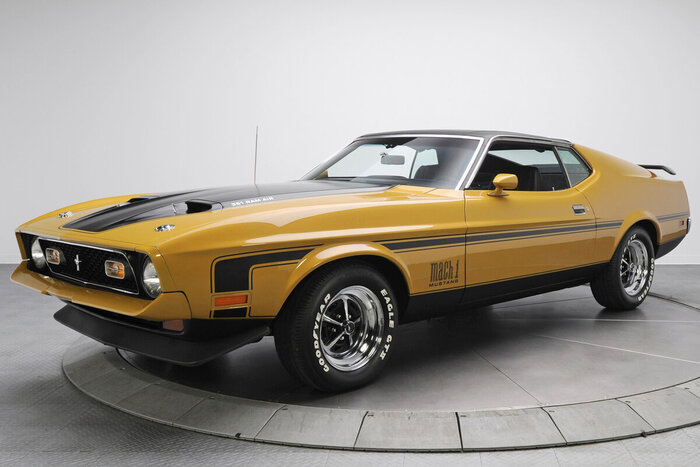 «Горячие» Mustang Mach I впервые появились в 1969 году и предлагались с «восьмерками» объемом до семи литров. На фото модель 1971-го в рестайлинговом «большом» кузове. Такую можно было заказать с одним из трех двигателей: с 4,9-литровым (302 куб. дюймов, 213 л.с.), 5,8-литровым (351 куб. дюймов, до 289 л.с.) и зверским 7,0-литровым Cobra Jet/Super Cobra Jet (429 куб. дюймов, до 380 л.с.). Со следующего года последний исчез из линейки Ford.