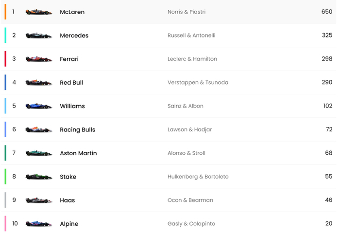 Борьба за личный титул стала максимально напряженной. Оскар Пиастри сохранил лидерство с 336 очками, опережая Ландо Норриса на 22 очка (314 очков). Макс Ферстаппен, несмотря на второе место, отстал на 63 очка, что делает его шансы на титул весьма призрачными.
