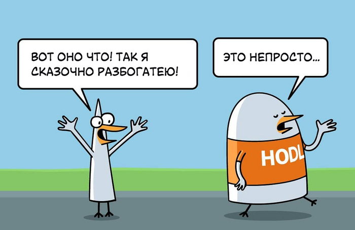 HODL — стратегия трейдинга, заключается в долгосрочном инвестировании — «купил и забыл». Слово HODL появилось в декабре 2013 года на форуме BitcoinTalk, где бухой пользователь выложил эмоциональный пост, заголовок которого гласил “I AM HODLING”. Опечатка в итоге стала мемом.