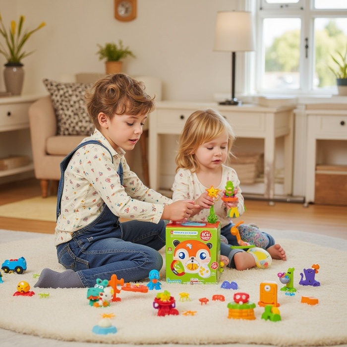 Kids’ item in a bright playroom, lots of bright toys, a safe home atmosphere, soft lighting, family comfort, professional shots